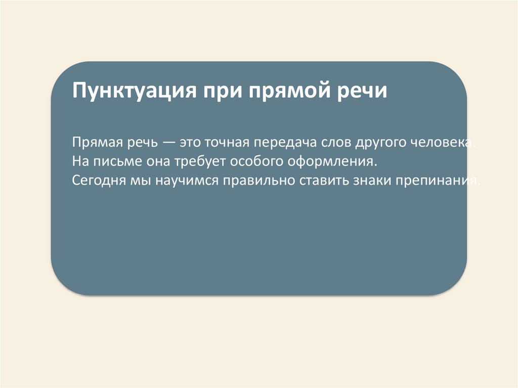 Пунктуация при прямой речиПрямая речь — это точная передача слов другого человека.