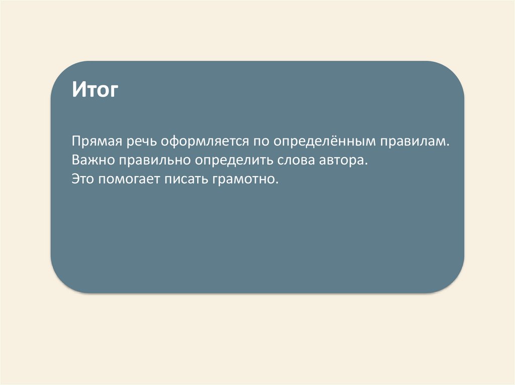 ИтогПрямая речь оформляется по определённым правилам.