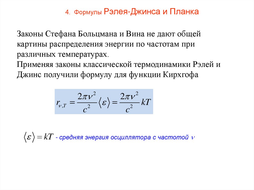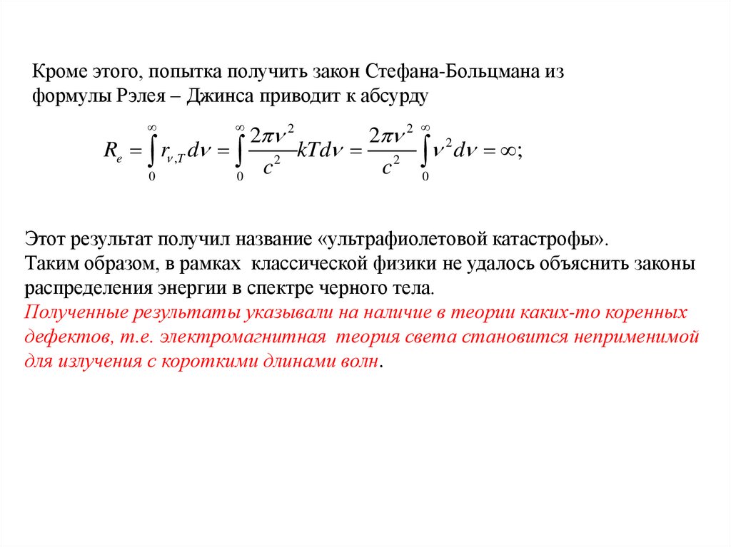 Кроме этого, попытка получить закон Стефана-Больцмана изформулы Рэлея – Джинса приводит к абсурду