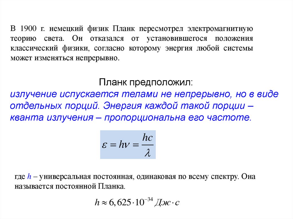 В 1900 г. немецкий физик Планк пересмотрел электромагнитнуютеорию света. Он отказался от установившегося положения