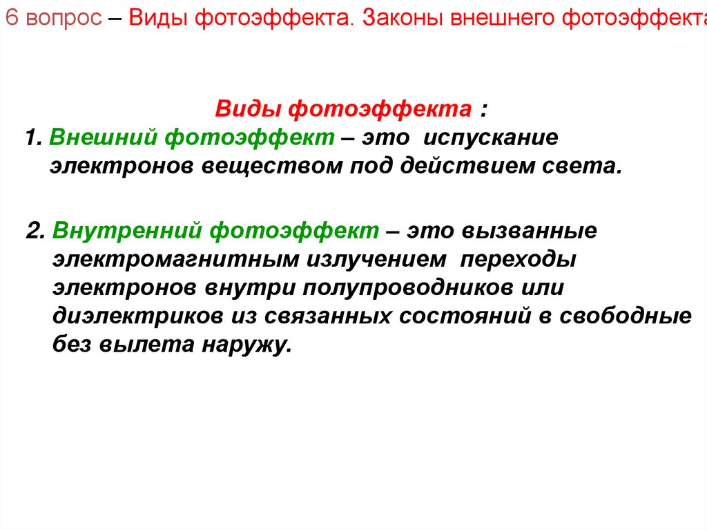 6 вопрос – Виды фотоэффекта. Законы внешнего фотоэффектаВиды фотоэффекта :