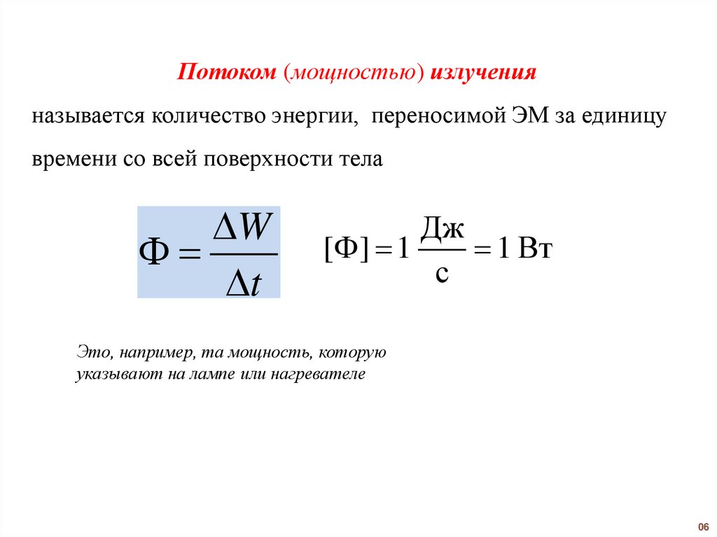 Потоком (мощностью) излученияназывается количество энергии, переносимой ЭМ за единицу