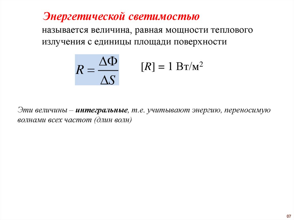 Энергетической светимостьюназывается величина, равная мощности теплового