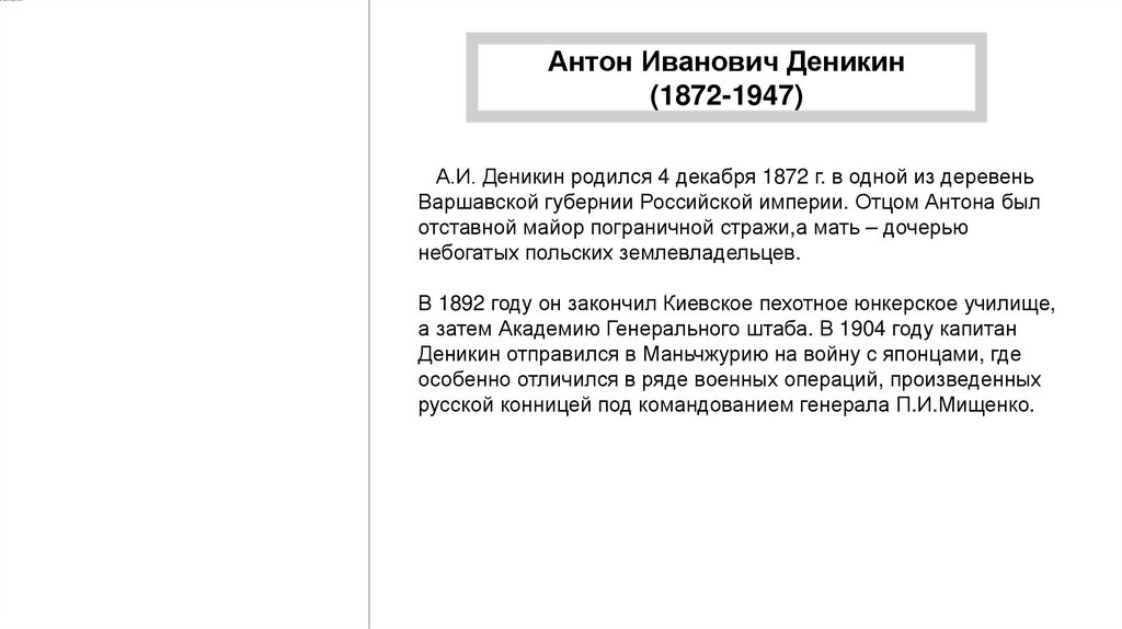 А.И. Деникин родился 4 декабря 1872 г. в одной из деревень