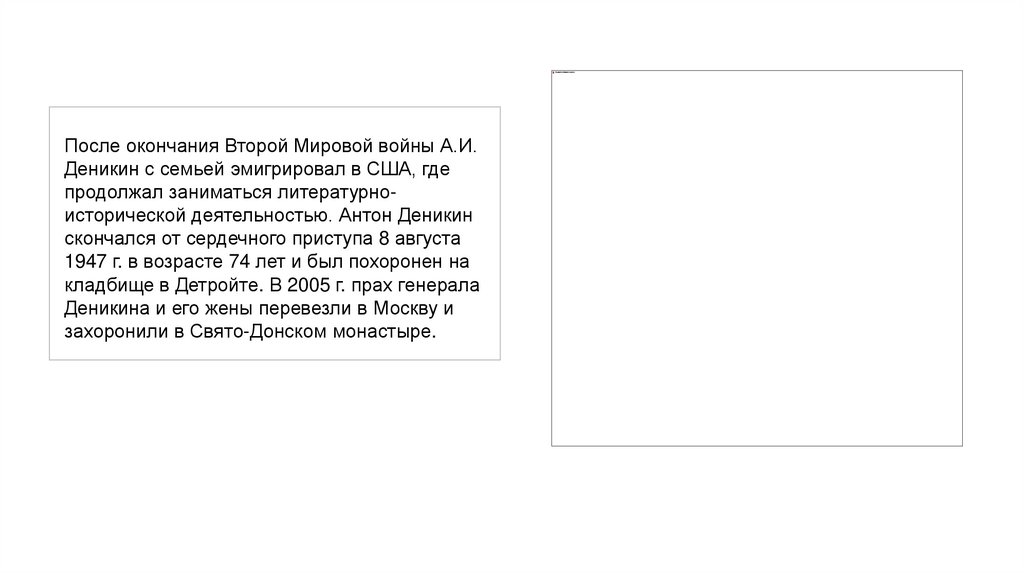 После окончания Второй Мировой войны А.И.Деникин с семьей эмигрировал в США, где