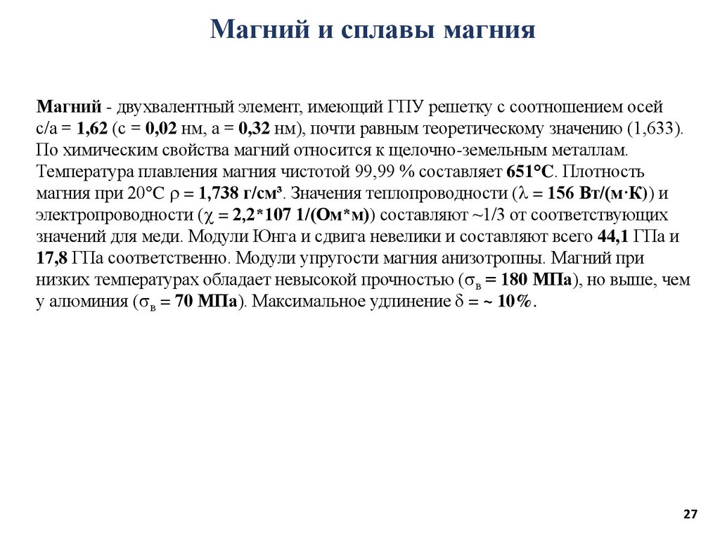 Магний и сплавы магнияМагний - двухвалентный элемент, имеющий ГПУ решетку с соотношением осей