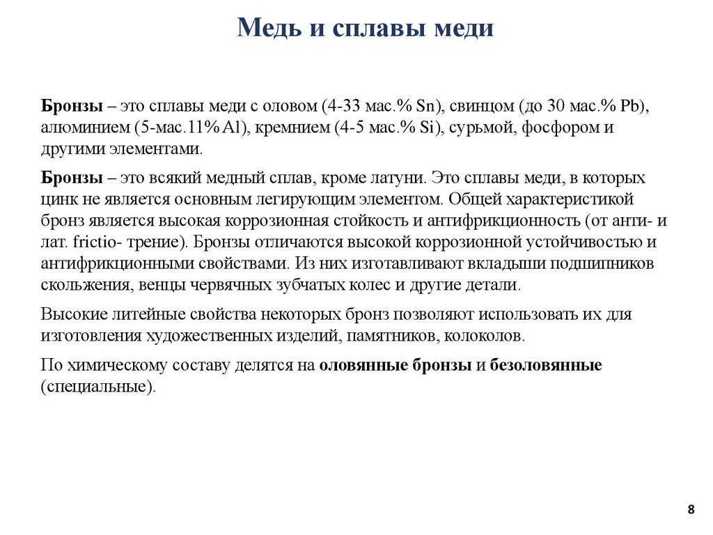 Бронзы – это всякий медный сплав, кроме латуни. Это сплавы меди, в которых