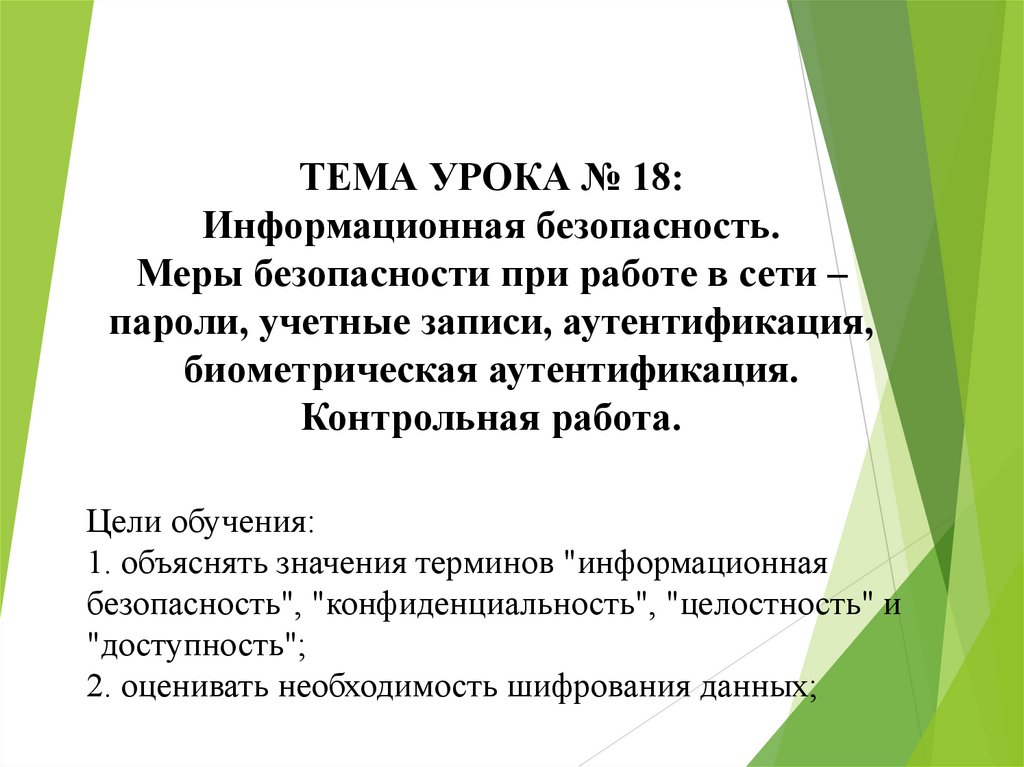 1. ТЕМА УРОКА № 18: Информационная безопасность. Меры безопасности при работе в сети – пароли, учетные записи, аутентификация,