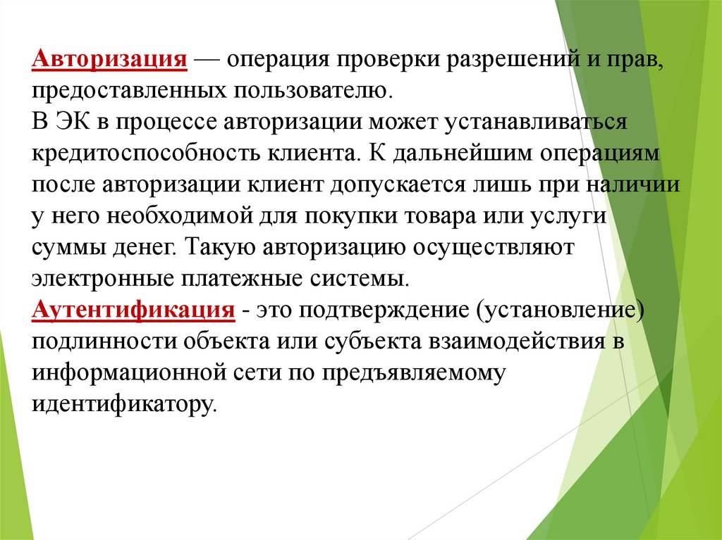 Авторизация — операция проверки разрешений и прав,предоставленных пользователю.