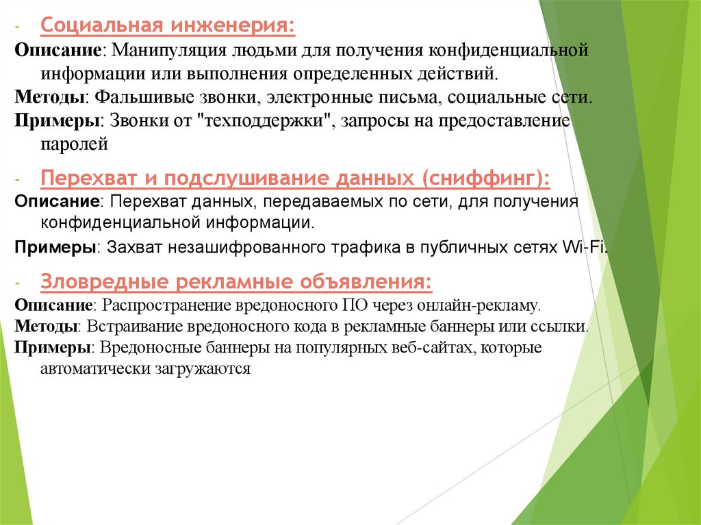- Фишинг:Описание: Мошеннические попытки получения конфиденциальной
