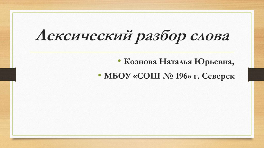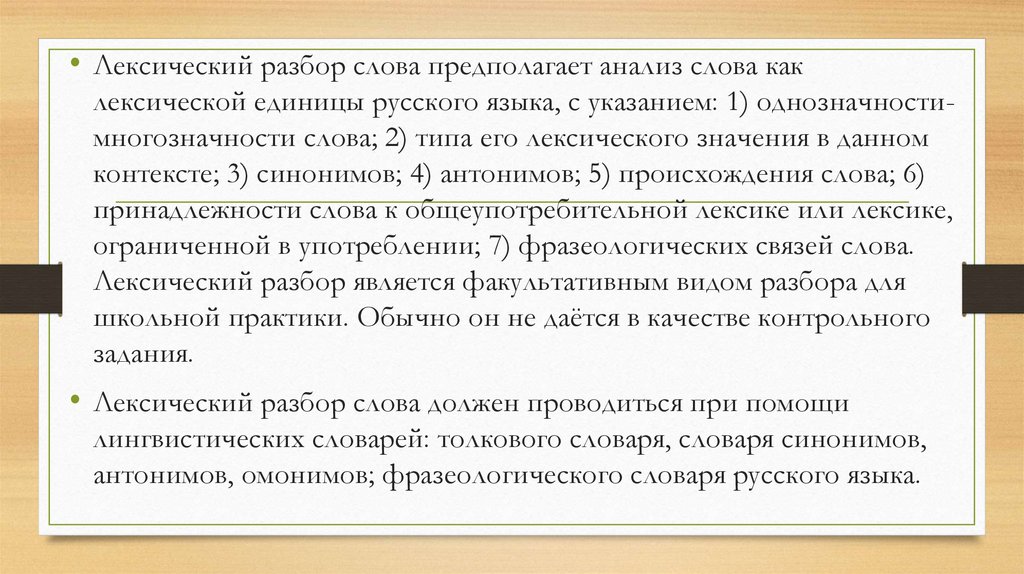 • Лексический разбор слова предполагает анализ слова каклексической единицы русского языка, с указанием: 1) однозначностимногозначности слова; 2) типа его лексического значения в данном