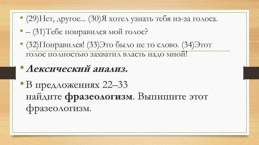 • (29)Нет, другое... (30)Я хотел узнать тебя из-за голоса.• – (31)Тебе понравился мой голос?