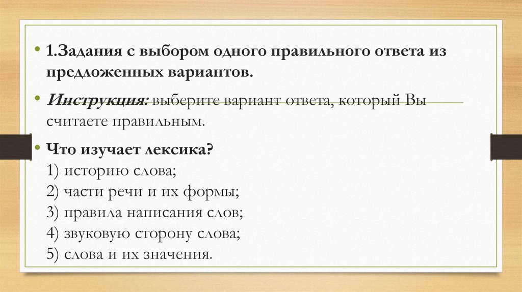 • 1.Задания с выбором одного правильного ответа изпредложенных вариантов.