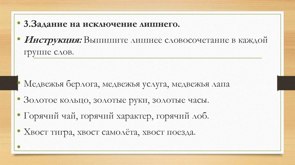 • 3.Задание на исключение лишнего.• Инструкция: Выпишите лишнее словосочетание в каждой