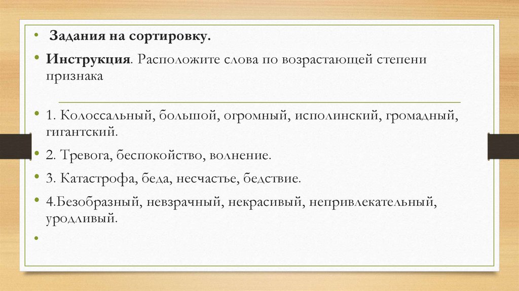 • Задания на сортировку.• Инструкция. Расположите слова по возрастающей степени