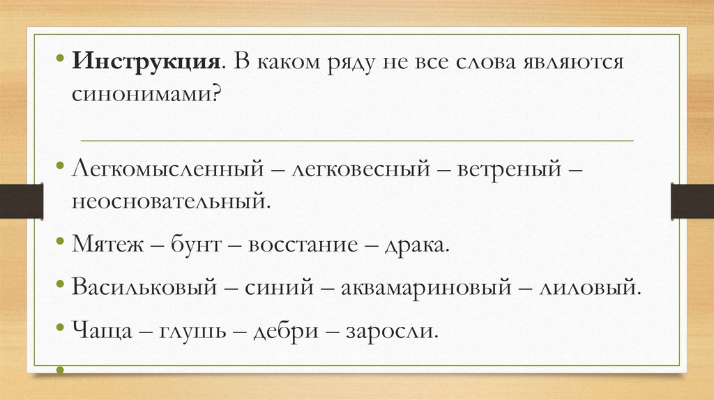 • Инструкция. В каком ряду не все слова являютсясинонимами?