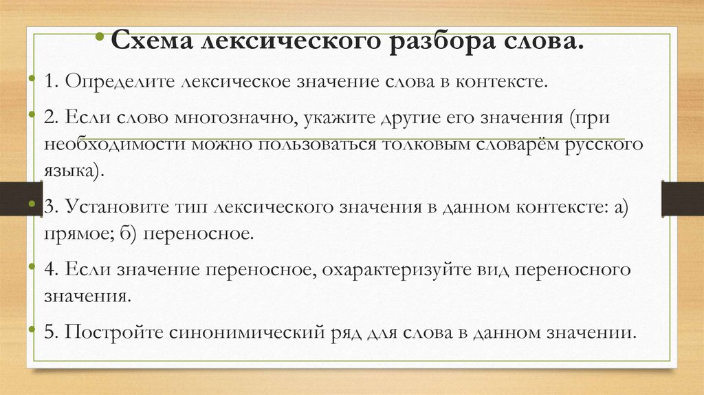• Схема лексического разбора слова.• 1. Определите лексическое значение слова в контексте.