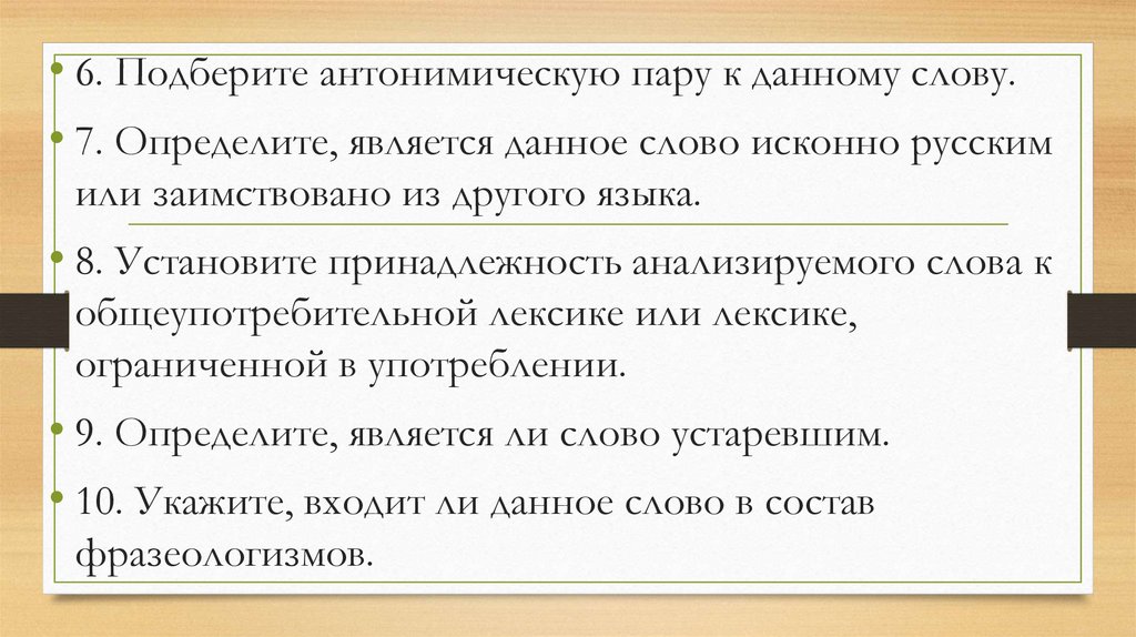 • 6. Подберите антонимическую пару к данному слову.• 7. Определите, является данное слово исконно русским