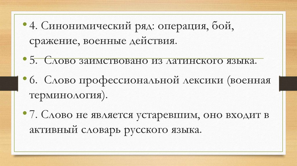 • 4. Синонимический ряд: операция, бой,сражение, военные действия.