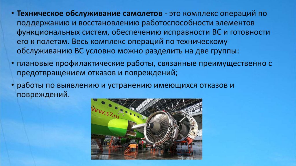 • Техническое обслуживание самолетов - это комплекс операций поподдержанию и восстановлению работоспособности элементов