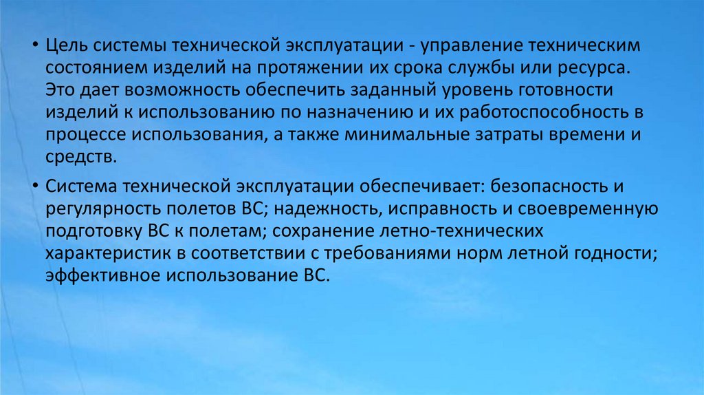 • Цель системы технической эксплуатации - управление техническимсостоянием изделий на протяжении их срока службы или ресурса.