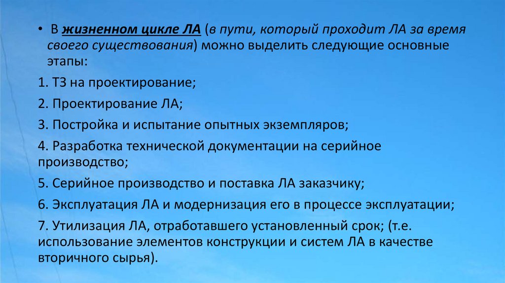 • В жизненном цикле ЛА (в пути, который проходит ЛА за времясвоего существования) можно выделить следующие основные