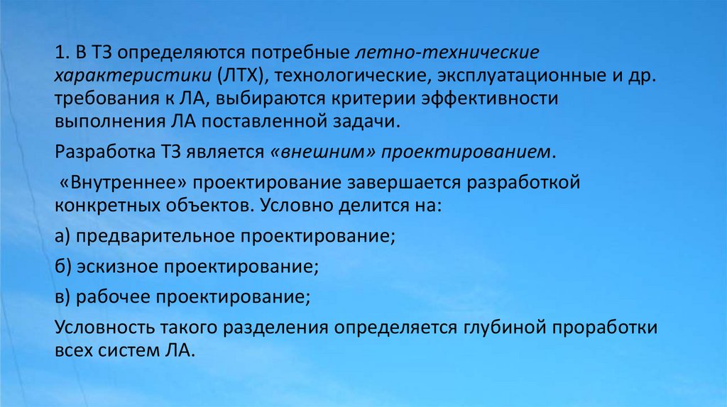 1. В ТЗ определяются потребные летно-техническиехарактеристики (ЛТХ), технологические, эксплуатационные и др.