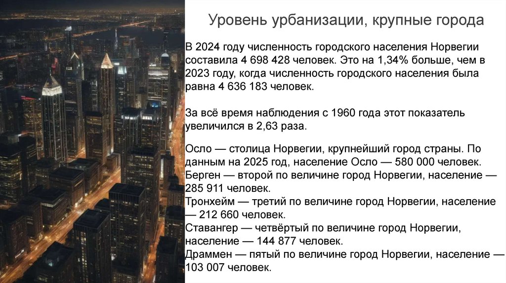 Уровень урбанизации, крупные городаВ 2024 году численность городского населения Норвегии