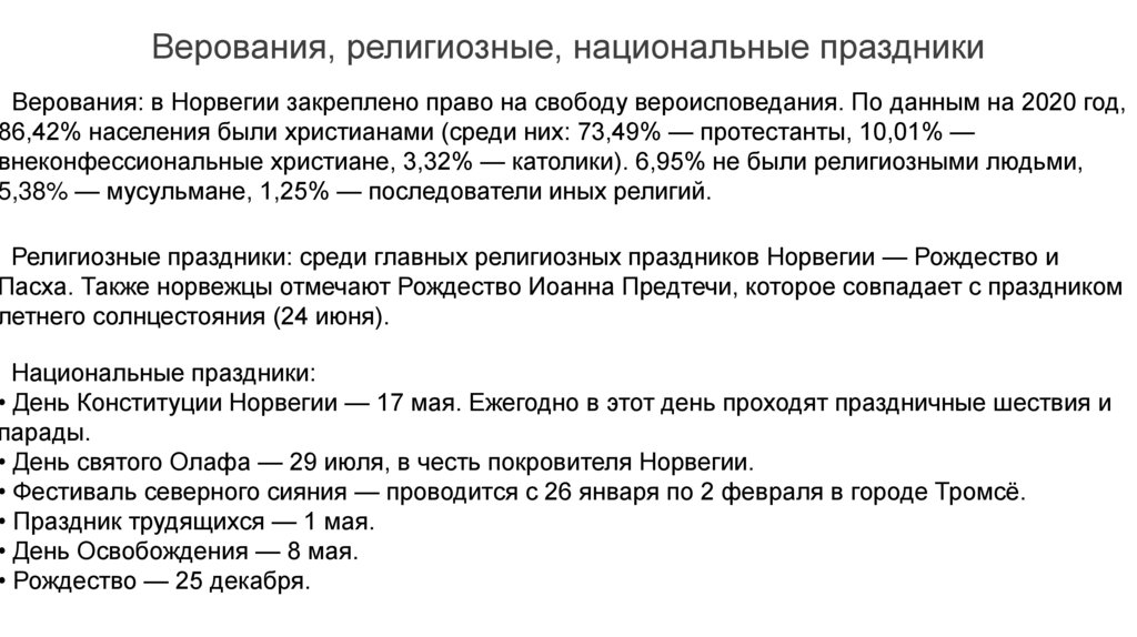 Верования, религиозные, национальные праздникиВерования: в Норвегии закреплено право на свободу вероисповедания. По данным на 2020 год,