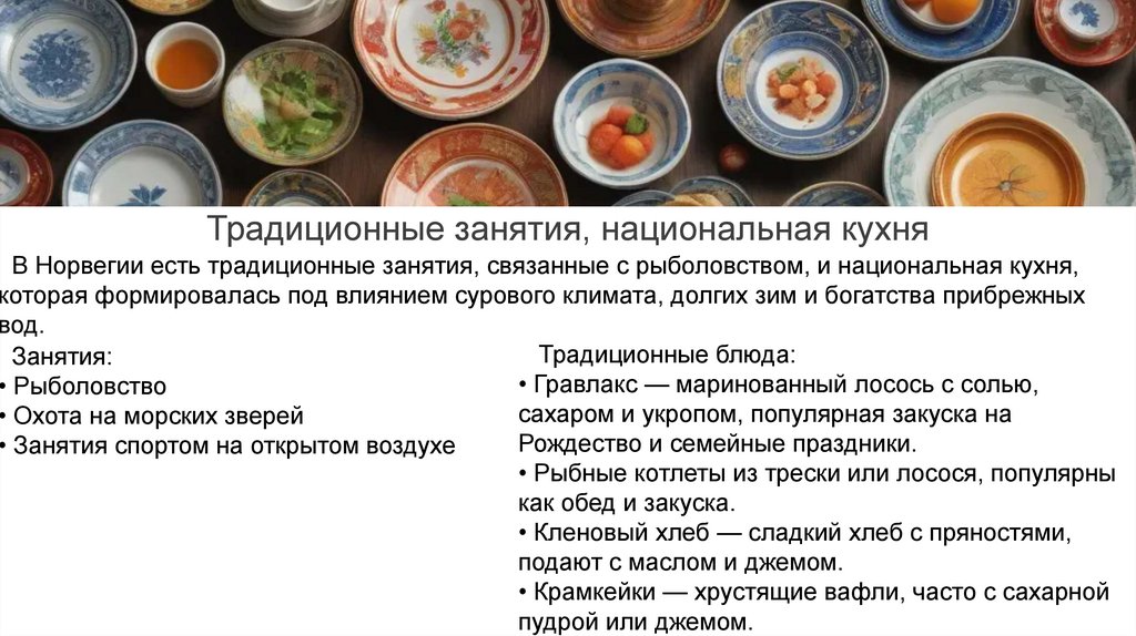 Традиционные занятия, национальная кухняВ Норвегии есть традиционные занятия, связанные с рыболовством, и национальная кухня,