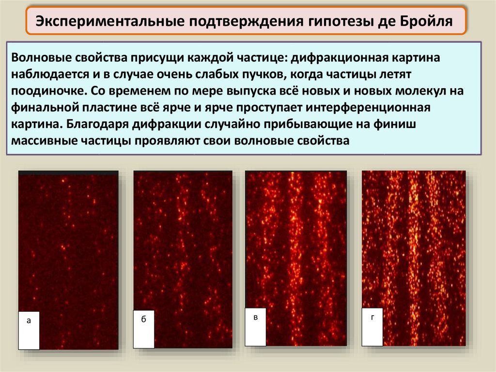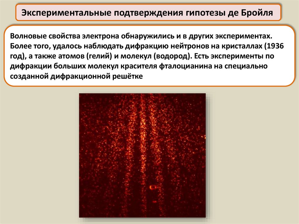 Экспериментальные подтверждения гипотезы де БройляВолновые свойства присущи каждой частице: дифракционная картина