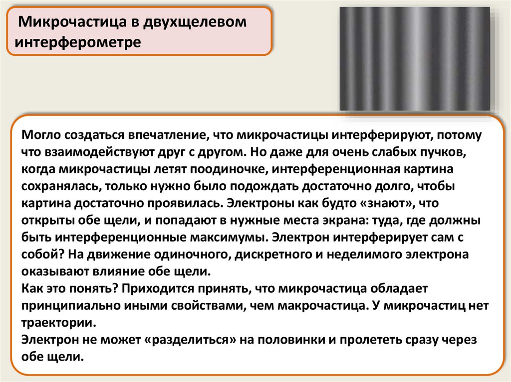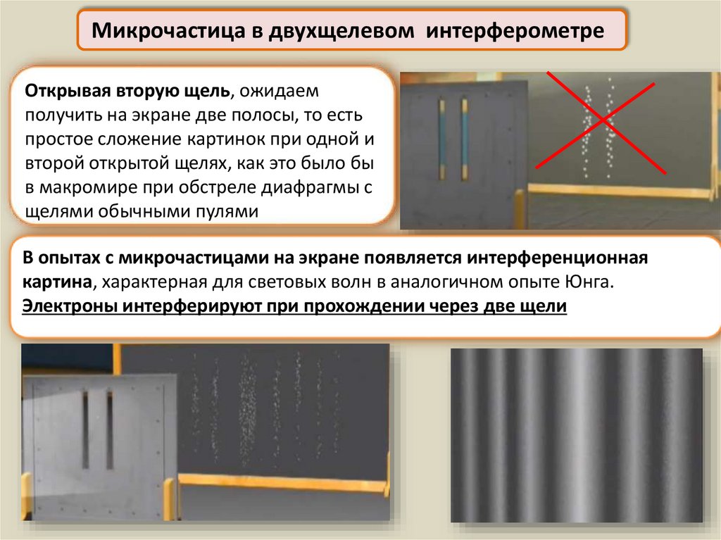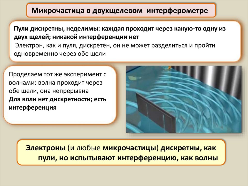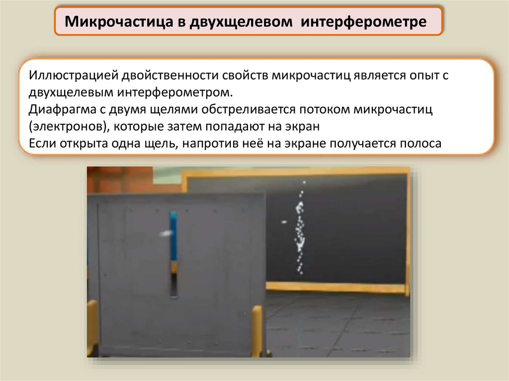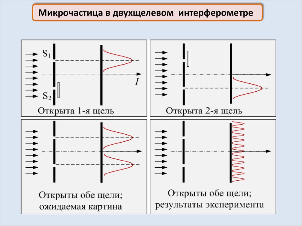 Микрочастица в двухщелевом интерферометреИллюстрацией двойственности свойств микрочастиц является опыт с