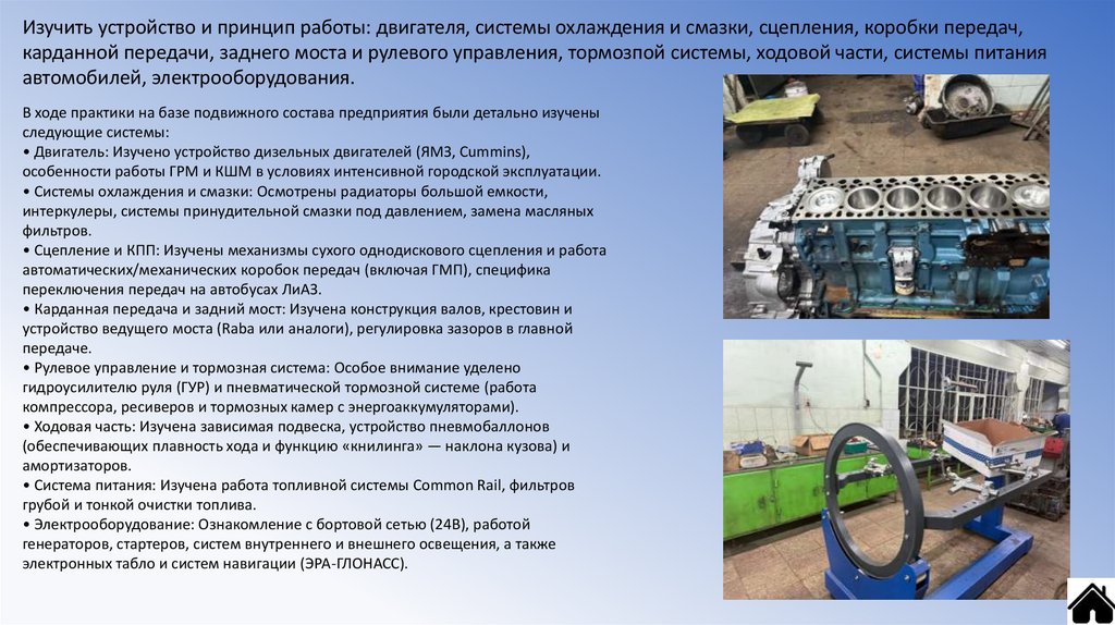 • Двигатель: Изучено устройство дизельных двигателей (ЯМЗ, Cummins),