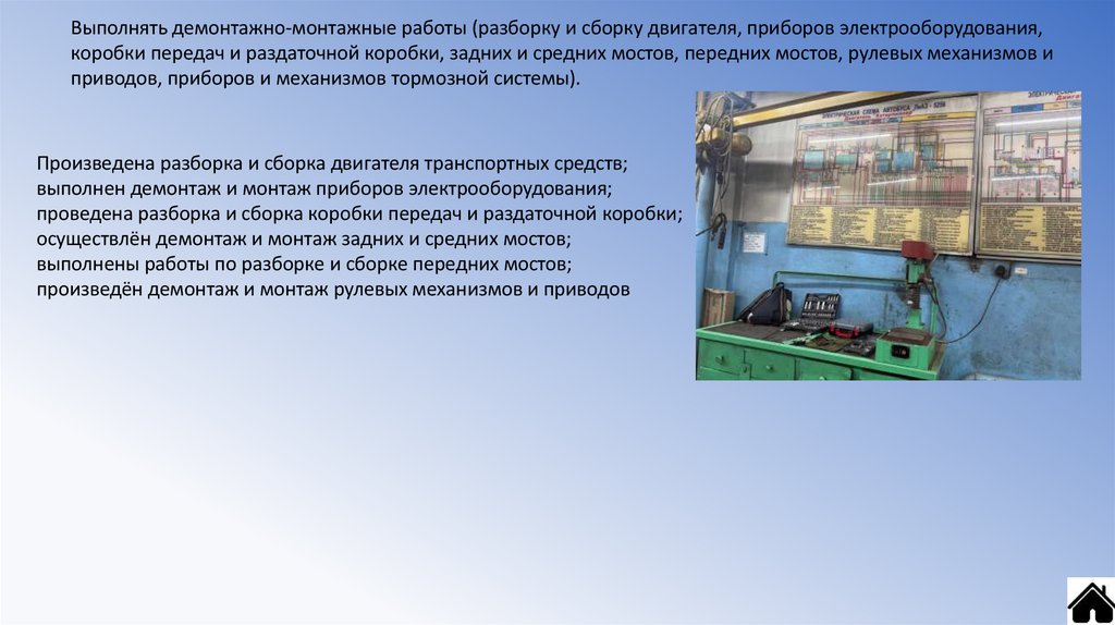 Выполнять демонтажно-монтажные работы (разборку и сборку двигателя, приборов электрооборудования,коробки передач и раздаточной коробки, задних и средних мостов, передних мостов, рулевых механизмов и
