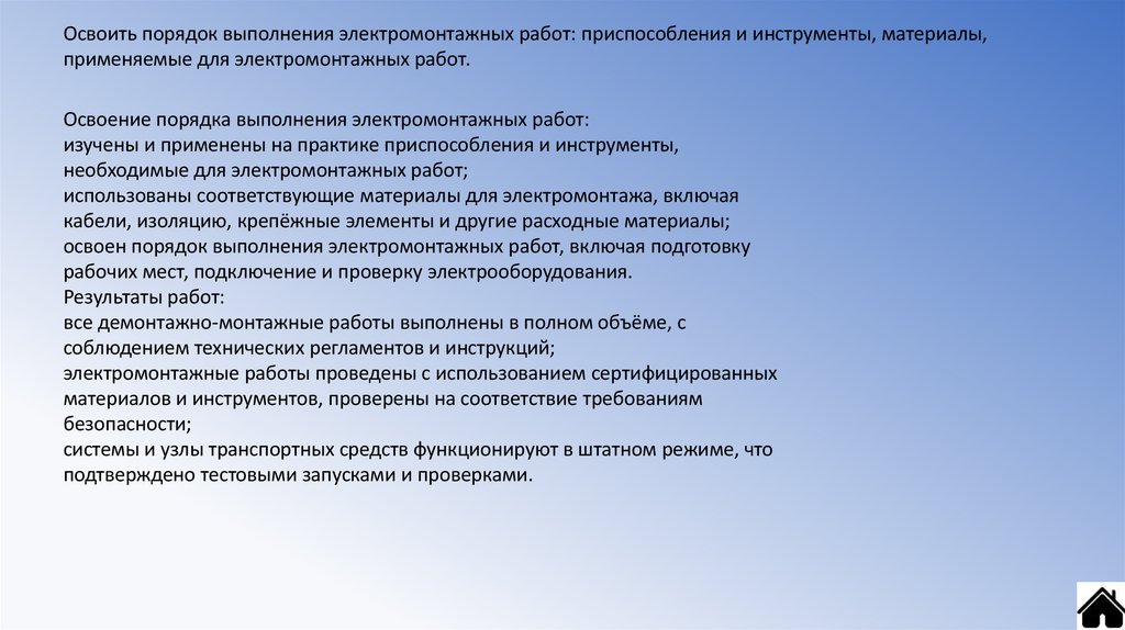освоен порядок выполнения электромонтажных работ, включая подготовку