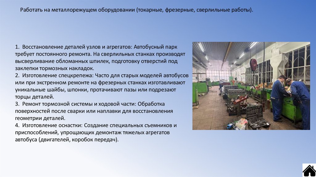 Работать на металлорежущем оборудовании (токарные, фрезерные, сверлильные работы).1. Восстановление деталей узлов и агрегатов: Автобусный парк