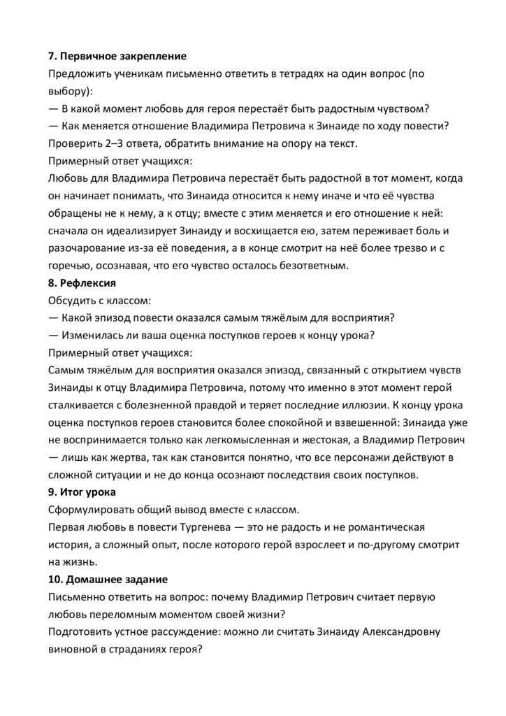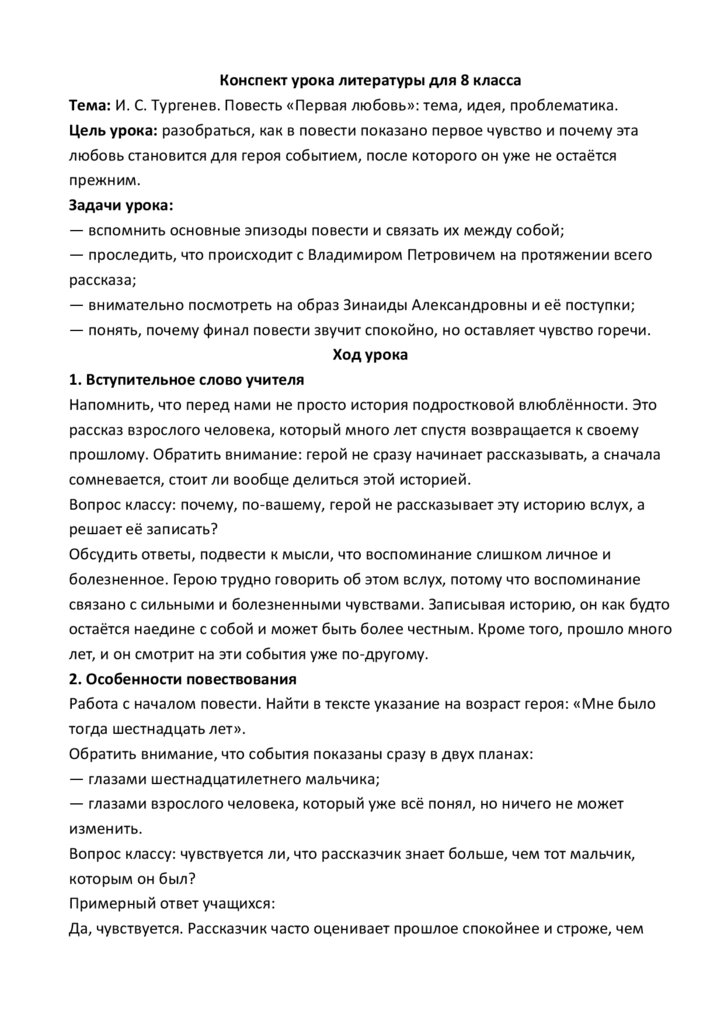 Конспект урока литературы для 8 классаТема: И. С. Тургенев. Повесть «Первая любовь»: тема, идея, проблематика.