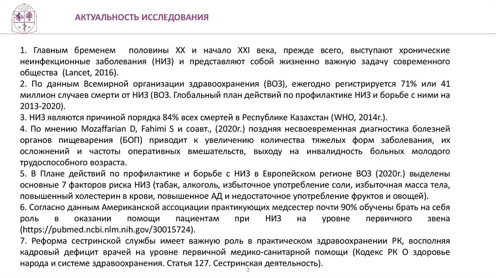 3. НИЗ являются причиной порядка 84% всех смертей в Республике Казахстан (WHO, 2014г.).