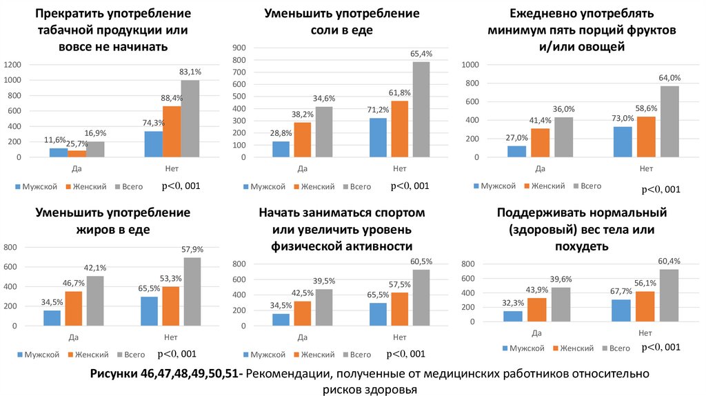 снижение потребления соли (34,6), ежедневному употреблению фруктов и овощей (36,0%), контролю веса (39,6%), увеличение физической