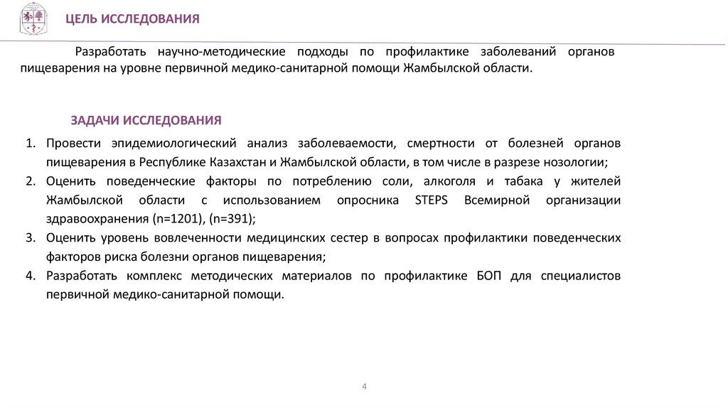 ЦЕЛЬ ИССЛЕДОВАНИЯРазработать научно-методические подходы по профилактике заболеваний органов