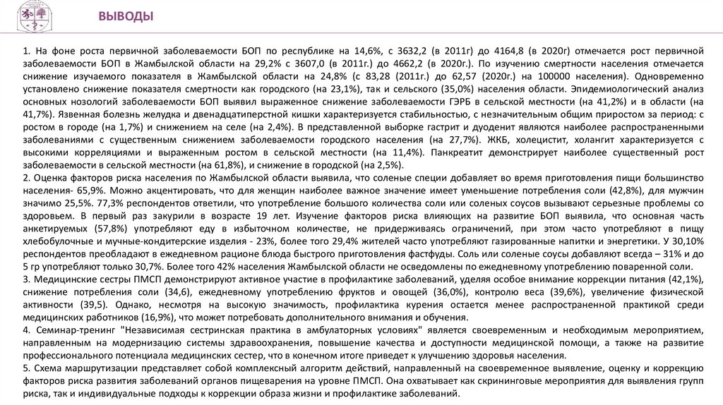 заболеваемости БОП в Жамбылской области на 29,2% с 3607,0 (в 2011г.) до 4662,2 (в 2020г.). По изучению смертности населения отмечается