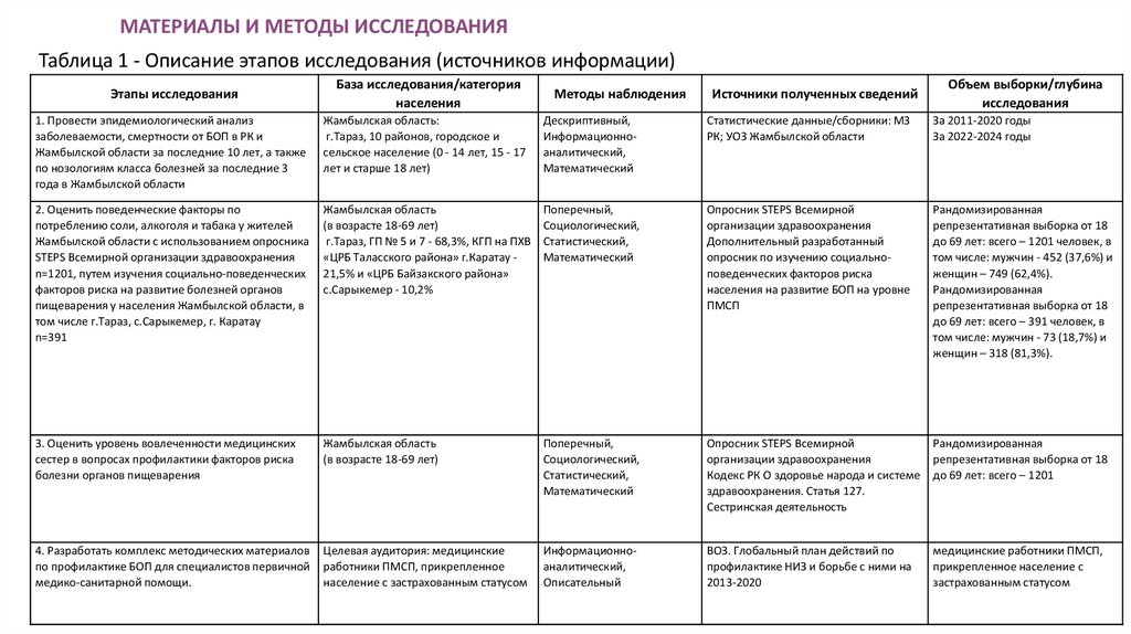 МАТЕРИАЛЫ И МЕТОДЫ ИССЛЕДОВАНИЯТаблица 1 - Описание этапов исследования (источников информации)