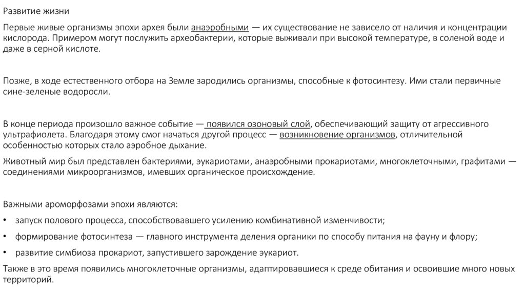Развитие жизниПервые живые организмы эпохи архея были анаэробными — их существование не зависело от наличия и концентрации