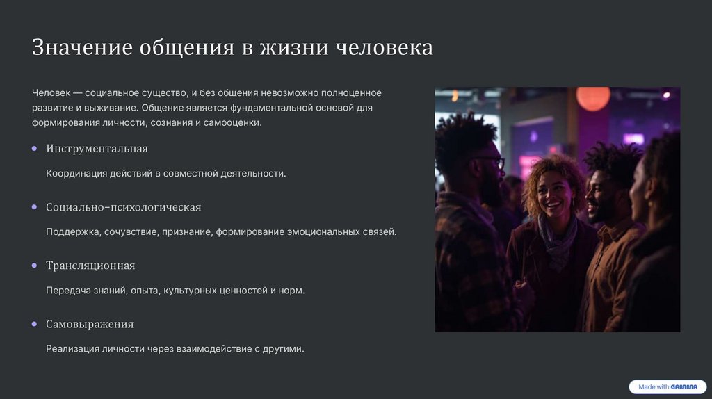 Значение общения в жизни человекаЧеловек — социальное существо, и без общения невозможно полноценное