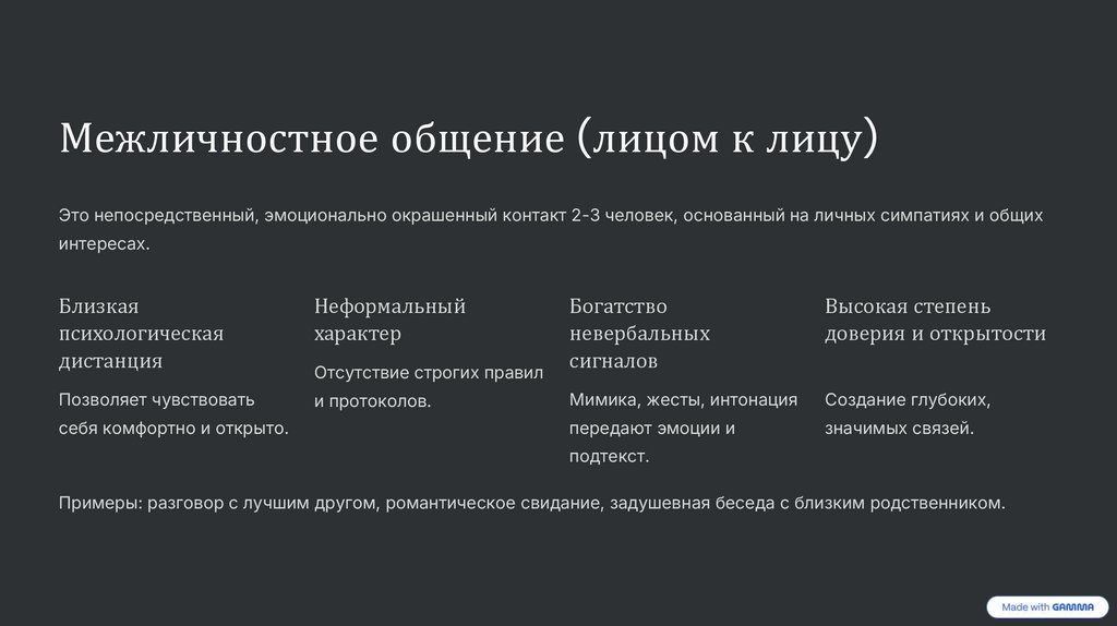 Межличностное общение (лицом к лицу)Это непосредственный, эмоционально окрашенный контакт 2-3 человек, основанный на личных симпатиях и общих