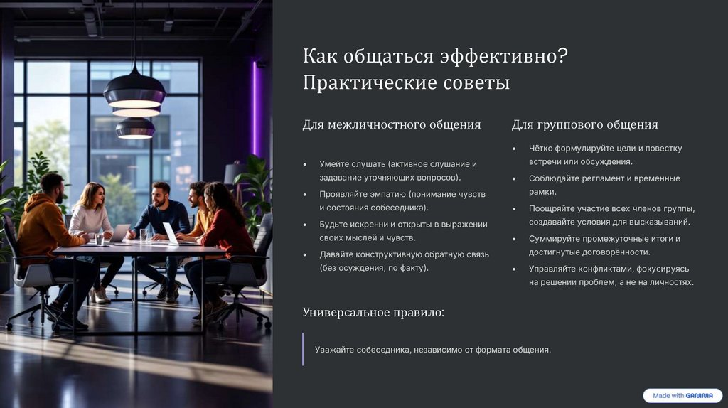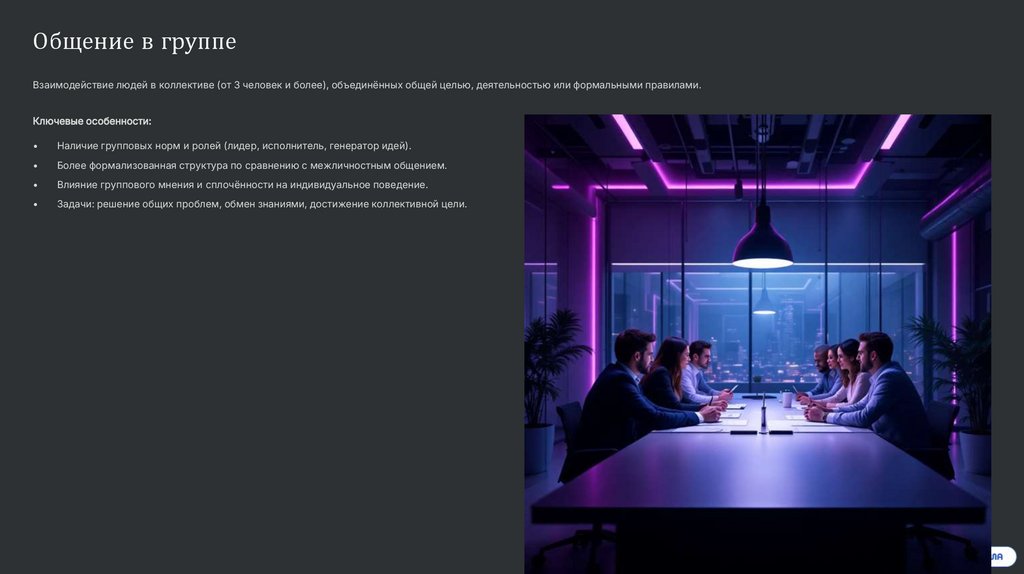 Общение в группеВзаимодействие людей в коллективе (от 3 человек и более), объединённых общей целью, деятельностью или формальными правилами.