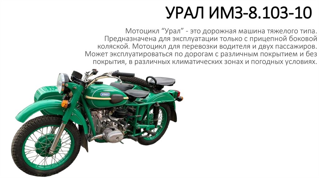 УРАЛ ИМЗ-8.103-10Мотоцикл “Урал” - это дорожная машина тяжелого типа.
