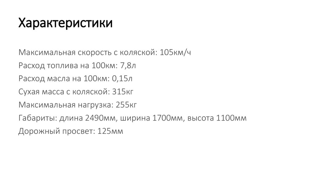 ХарактеристикиМаксимальная скорость с коляской: 105км/ч