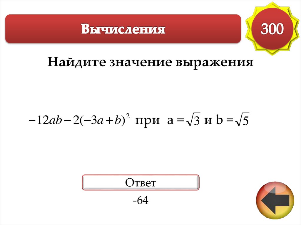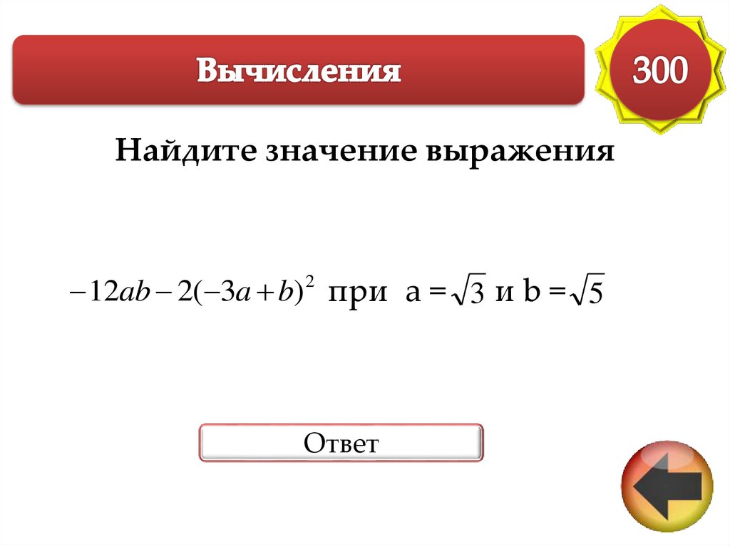 Найдите значение выражения12ab 2( 3a b) при a = 3 и b = 5
