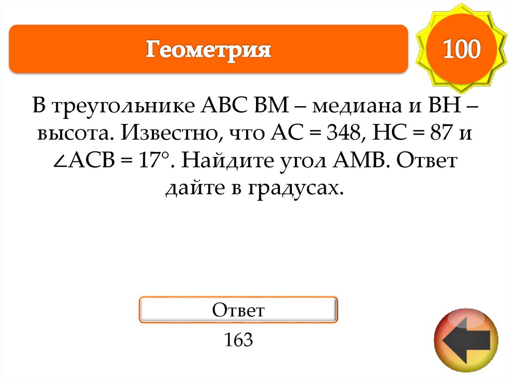 ∠ACB = 17°. Найдите угол AMB. Ответ